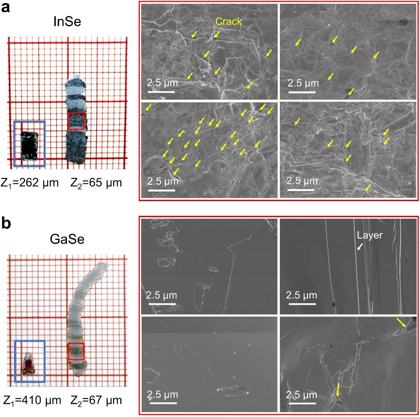 图2. InSe和GaSe样品室温辊压前后的形状变化以及冷轧后的表面扫描电镜表征