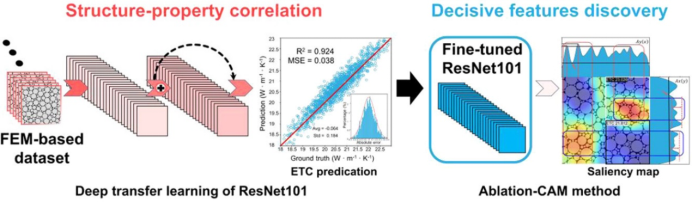 强度室的邓俊楷教授课题组,利用深度学习和可解释机器学习技术,针对UO2-BeO复合燃料微结构和热导率的关联性开展了研究。首先通过高通量有限元计算,获得一批与实际微结构相符的复合燃料模型与热导率的材料数据集。为解决因数据量不足且样本区分度不高的问题,研究中采用了深度迁移学习,有效的减小了数据标定所需的数据集规模,并大幅提高了热导率机器学习预测模型的性能。随后,利用可解释机器学习技术和基于物理直觉的参数模型,成功识别并提出了对复合燃料热导率具有重要影响的关键微结构特征,并对其进行了验证。通过深度学习方法提取的影响复合燃料热导率的关键微结构特征,将对高热导的复合燃料设计提供理论指导,并有望通过先进的增材制造技术实现。