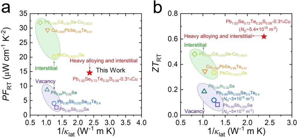 金属材料强度国家重点实验室肖钰特聘研究员与北航赵立东教授合作,提出了一种重合金固溶结合间隙原子掺杂提升半导体热电材料位错密度的方法。实验以PbSe半导体热电材料为例,通过大量Te/S合金固溶结合Cu间隙原子掺杂使基体位错密度高达5.4×1016m-2。基体中广泛分布的小尺寸位错聚集形成位错网络,引起晶格畸变产生应力,大幅增强全温区声子散射,使室温晶格热导率降低至0.42 W m-1K-1,且在300-773K温度范围内始终低于0.5 W m-1K-1(图1)。研究还发现,与阳离子空隙引入的位错体系相比,通过金属间隙原子引入的位错因具有局部电子传导特性,可以很好保持N型热电材料的电传输性能。最终在Pb1.02Se0.72Te0.20S0.08-0.3%Cu样品中获得高的近室温功率因子,室温ZT值高达0.62(图2)。低温区(300-573 K)和中低温区(300-773K)的平均ZT值(ZTave)分别达到0.90和0.96,优于前期报道的PbSe基热电材料。实验证明,重合金固溶结合间隙原子掺杂是一种提升半导体热电材料位错密度的有效方法,为设计宽温域高效半导体热电材料提供了新思路。