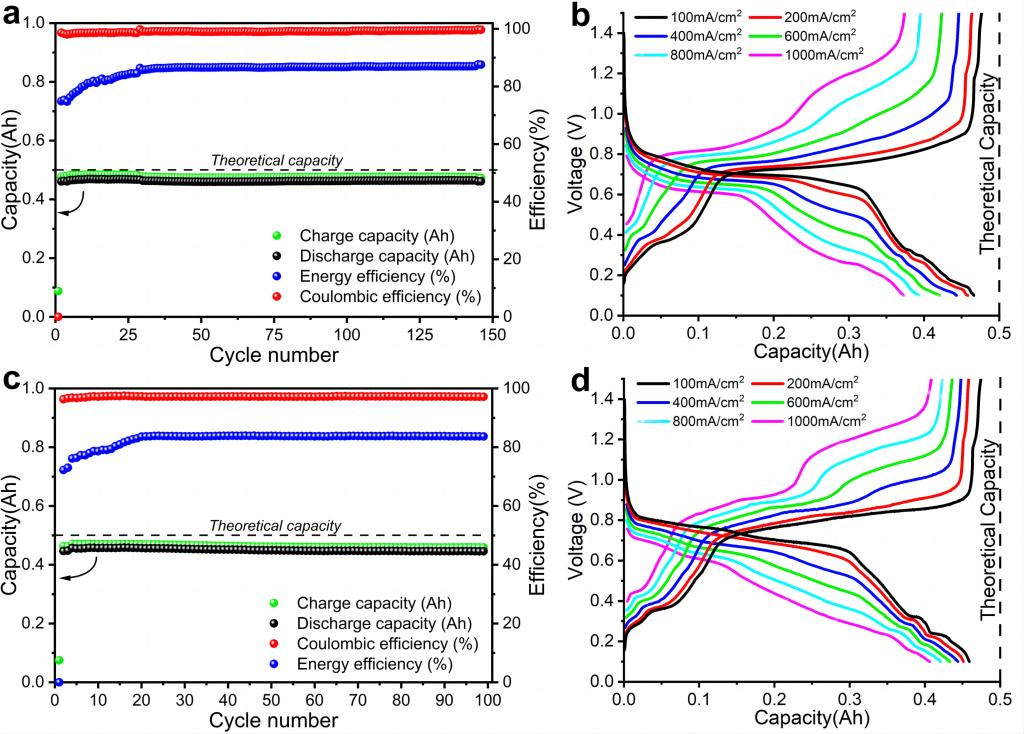图2 Li||Sb20Bi60Sn10Pb10电池在(a)100 mA cm-2电流密度下的循环性能曲线和(b)不同倍率下的充放电曲线;Li||Sb50Bi30Sn10Pb10电池在(c)100 mA cm-2电流密度下的循环性能曲线和(d)不同倍率下的充放电曲线