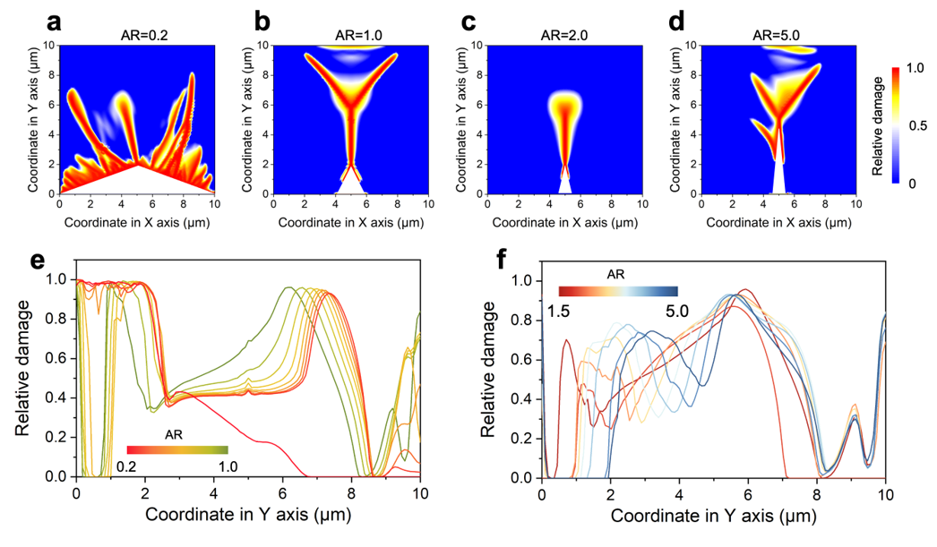 (2) 揭示了金属锂在界面缺陷处沉积引发固态电解质失效的机理。研究发现,界面缺陷的几何形状是局部应力场集中的主导因素,而半球形缺陷在初始阶段造成较少的损伤累积和最长的电解质解体失效时间。纵横比作为缺陷研究的关键几何参数对电解质失效过程具有显著影响,在低纵横比为0.2~0.5三棱锥界面缺陷附近显示出损伤的分支区域,可能导致固态电解质的表面粉化,而当界面缺陷的纵横比超过3.0时,将引发体电解质本体中的损伤累积。该成果以《界面缺陷对固态电解质电化学-力学失效的作用》(Role of interfacial defect on electro-chemo-mechanical failure of solid-state electrolyte)为题发表在材料领域知名期刊《先进材料》(Advanced Materials)上(图2,Adv. Mater. 2023, 2301152)。