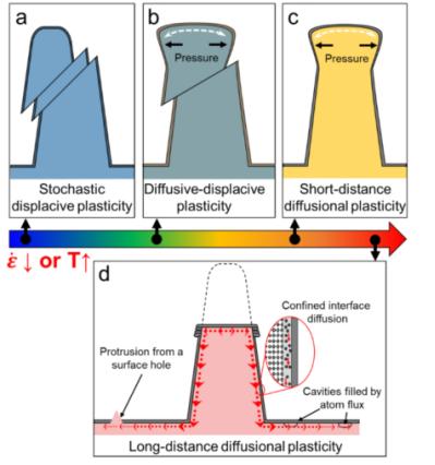 微/纳机电系统和小型化器件的广泛应用促进了对微纳米尺寸材料塑性变形行为的研究。已有的研究表明,微纳米尺寸金属材料的力学性能与尺寸密切相关。例如,材料强度与尺寸之间呈现出“越小越强”的关系;或在样品尺寸进一步减小的情况下,呈现“越小越弱”。从根本上说,这种强烈的尺寸依赖性源于两种基本的塑性机制之间的相互作用,即位移型塑性和扩散型塑性,这已经在利用自支撑柱状样品(样品与大块基体材料相连)对小尺度塑性变形机制的实验研究中被证明。在这些研究中,无论自支撑柱状样品采用何种机制变形,原子通常只在样品内部交换位置,局部样品的总体积/质量保持不变。然而牵手