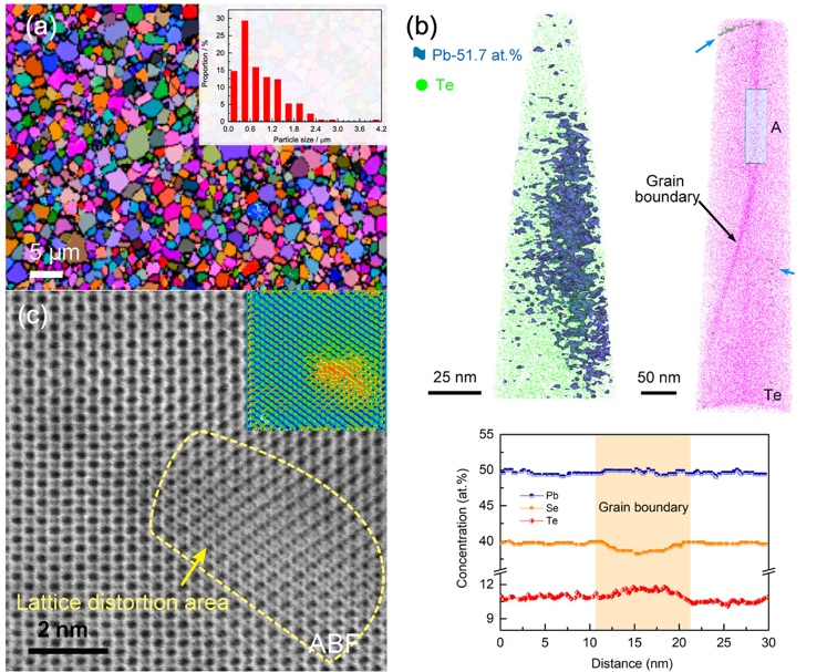 图1. Pb1.075Se0.8Te0.2的(a)晶界密度及晶粒尺寸的EBSD分析结果,(b)晶内缺陷及晶界成分的APT分析结果,以及(c)富铅纳米缺陷结构的Cs-STEM照片