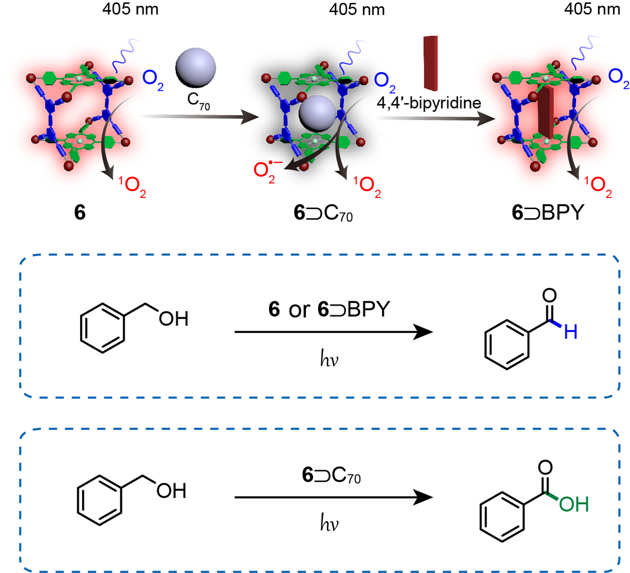 张明明教授课题组通过配位自组装,构筑了一类基于卟啉的多组分金属笼,并通过金属笼的主客体性质来调控活性氧物种的产生,实现了对苯甲醇的选择性光催化氧化。作者研究发现,在405nm光激发下,金属笼(6)能够有效地通过激发态能量转移的方式生成单线态氧(1O2)。然而,当金属笼(6)与C70结合形成主客体配合物(6⊃C70)后,电子转移途径被打开,从而促进了超氧阴离子自由基(O2·−)的产生,同时生成1O2与O2·−。接着,在配合物6⊃C70中引入4‘4-联吡啶(BPY)时,可以与金属笼配位形成稳定性更高的配合物(6⊃BPY),将C70从空腔中挤出去,恢复高效的1O2产生能力。接下来作者对苯甲醇光催化反应进行了探究。结果表明,配合物6和6⊃BPY可以有效的将苯甲醇氧化为苯甲醛,而配合物6⊃C70则可以将其氧化为苯甲酸,该类反应的产率与选择性都可以达到90%以上。本研究不仅展示了一种可调控的基于金属笼状化合物的主客体识别模式,还探讨了其在选择性光催化中调节活性氧(ROS)生成的潜力。近日,该研究成果以《卟啉金属笼主客体化学调控活性氧的生成用于选择性光催化》(Guest-Regulated Generation of Reactive Oxygen Species from Porphyrin-Based Multicomponent Metallacages for Selective Photocatalysis)为题发表在国际化学领域权威期刊《德国应用化学》(Angewandte Chemie International Edition)上。该论文第一作者为牵手