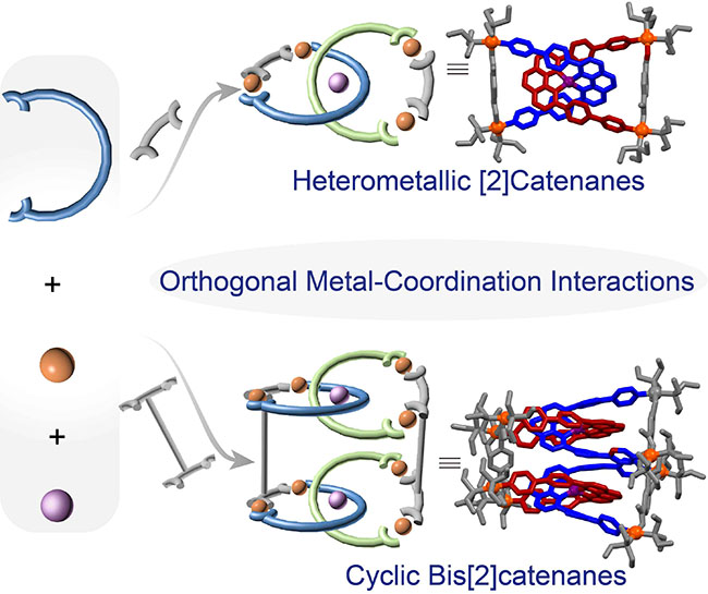 张明明教授课题组利用Cu/菲罗啉单元与Pt/吡啶/羧酸的正交自组装,高效制备了一系列双金属核[2]索烃和环状双[2]索烃,其结构得到了单晶X射线衍射的验证。该工作首次报道了由正交金属配位自组装制备的刚性环状双[2]索烃,为利用索烃来构筑高阶机械互锁结构提供了新的思路。之后作者发现这类结构具有广谱的抗菌性能,为高阶超分子结构在生物医学领域的应用提供了借鉴。近日,该研究成果以《基于正交金属配位作用的异核双金属[2]索烃和环状双[2]索烃的高效自组装》(Highly Efficient Self-Assembly of Heterometallic [2]Catenanes and Cyclic Bis[2]catenanes via Orthogonal Metal-Coordination Interactions)为题发表在国际化学领域权威期刊《德国应用化学》(Angewandte Chemie International Edition)上。该论文的第一作者为牵手