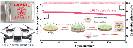 宋江选教授团队提出了一种固体电解质中间相力学和锂晶体学协同调控新方法,通过使用氟化钇/甲基丙烯酸甲酯复合层解决了锂金属负极界面稳定性差的难题。研究人员通过复合层与锂金属的原位反应生成Y掺杂锂金属,诱导锂沉积过程中的晶体学优先取向从传统的(110)晶面转变为(200)晶面,促使锂金属与电解液之间的副反应降低了80%。同时,所采用的活性聚合物复合层兼顾锂离子传输能力和良好的力学性能,可显著改善界面层的离子电导率和机械稳定性。基于上述策略所制备的4.2 Ah大容量软包电池能量密度高达468 Wh kg-1,显著提升了小型无人机的续航时间;且在高面容量正极(6 mAh cm-2)、贫电解液(1.98 g Ah-1)和高电流密度(3 mA cm-2)的苛刻条件下展现出优异的循环稳定性,单圈容量衰减率仅为0.08%。本研究为高比能锂金属电池的开发提供了新的思路。相关研究成果发表在国际知名期刊Nature Communications上,牵手