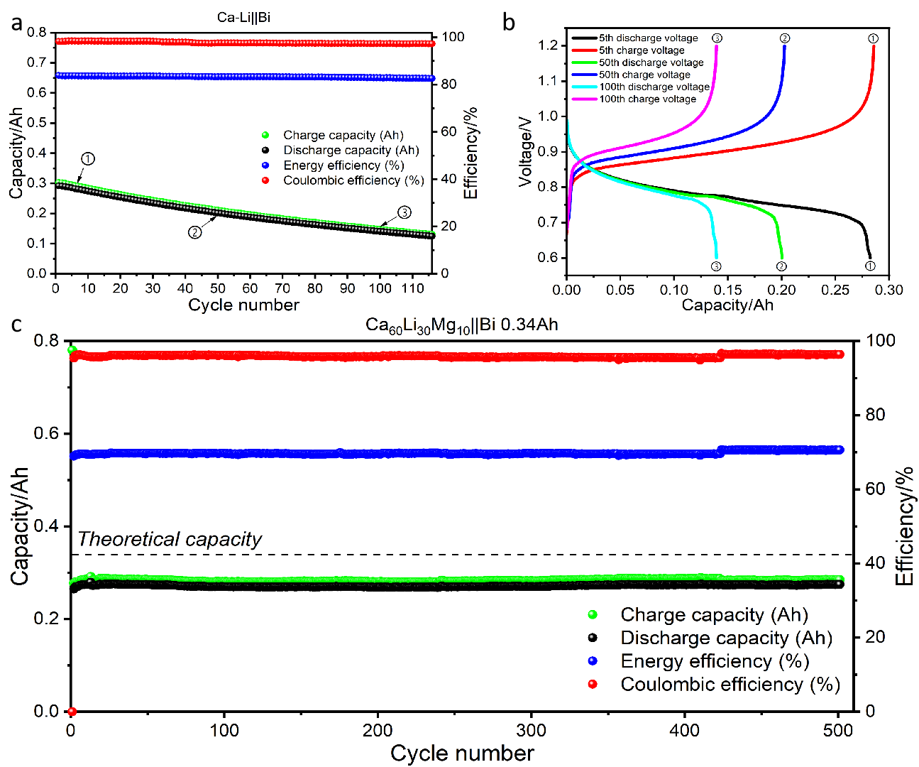 图2 双阳离子电池电化学性能 (a)Ca-Li||Bi循环曲线图 (b)Ca-Li||Bi充放电曲线 (c)Ca-Li-Mg||Bi循环曲线图