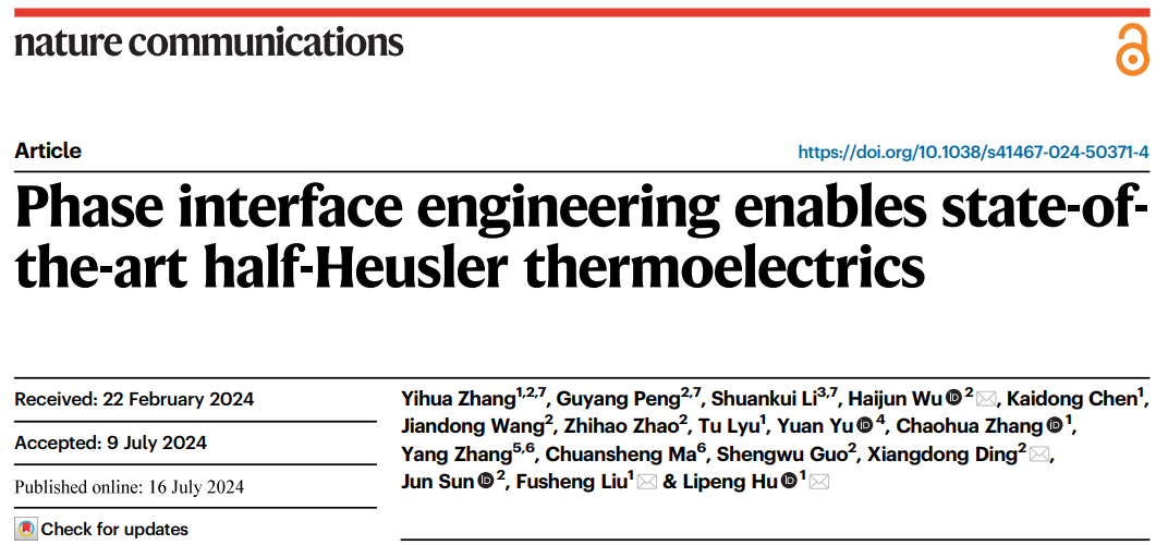 相关成果以《相界面工程优化半哈斯勒合金性能》(“Phase interface engineering enables state-of-the-art half-Heusler thermoelectrics”)为题发表在《自然·通讯》(Nature Communications)上。 牵手