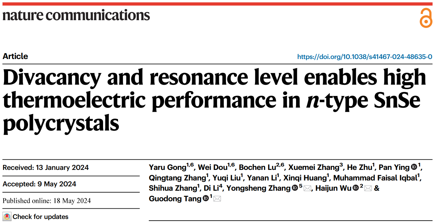 该研究成果以《双空位和共振能级优化n型SnSe多晶体热电性能》(“Divacancy and Resonance Level Enables High Thermoelectric Performance in n-Type SnSe Polycrystals”)为题发表于《自然·通讯》(Nature Communications 2024, 15, 4231)。武海军教授、曲阜师范大学张永胜教授和南京理工大学唐国栋教授为共同通讯作者, 牵手