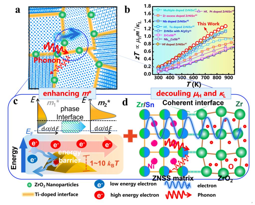 团队采用ALD技术在ZrNiSn基材料表面沉积TiO2层,并通过高温烧结过程巧妙地形成了Ti-ZNSS层及ZrO2纳米颗粒,构建出具有复合共格相界面的创新结构。进一步探究了这种复合共格相界面对电子和声子传输的深远影响,并通过精细的界面工程策略,有效调控了界面能量势垒,实现了在全温度范围内对态密度有效质量的显著提升。同时,利用共格复合相界面在散射声子、降低晶格热导率的同时,保持了较高的载流子迁移率,有效解决了传统相界面技术导致的载流子迁移率降低问题,并克服了单一能量势垒在高温下筛选低能载流子效果降低的缺陷。通过优化ALD涂层的厚度,实现了ZrNiSn基材料zT值的最大化,达到了1.3的高zT值,这一成果不仅刷新了热电材料性能的记录,也解决了传统热电材料中晶格热导率与载流子迁移率强耦合的技术难题,为热电材料的高性能化和实用化发展开辟了新的道路。