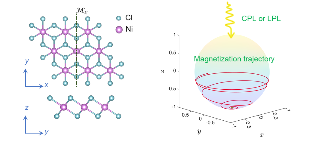 金属材料强度国家重点实验室材料创新设计中心(CAID)周健教授课题组通过非线性光学理论,推导了光子吸收下非平衡自旋态的能带理论,阐明了动量空间中布洛赫电子态几何结构张量的作用,并指出了这一过程中的电子拓扑态的意义。另外,他们还揭示了轨道磁矩和自旋磁矩具有同等重要的作用,这与平衡态电子行为完全不同。进一步地,他们以铁磁单层NiCl2材料为例,展示了光场对自旋和轨道磁矩的扭矩作用及磁动力学行为。通过磁空间群分析和第一性原理计算,表明无论线偏振光还是圆偏振光照射均可以在体系中产生面外有效磁场B和有效扭矩T,但其布洛赫态几何结构来源不同。磁动力学模拟表明,在中等强度光照下即可有效调控磁矩方向,并且这一过程可以在亚纳秒-皮秒量级内完成,展现出超快量子操控的潜力。以上理论也可以应用在多种具有类似磁对称性的材料体系中,具有一定的普适性。