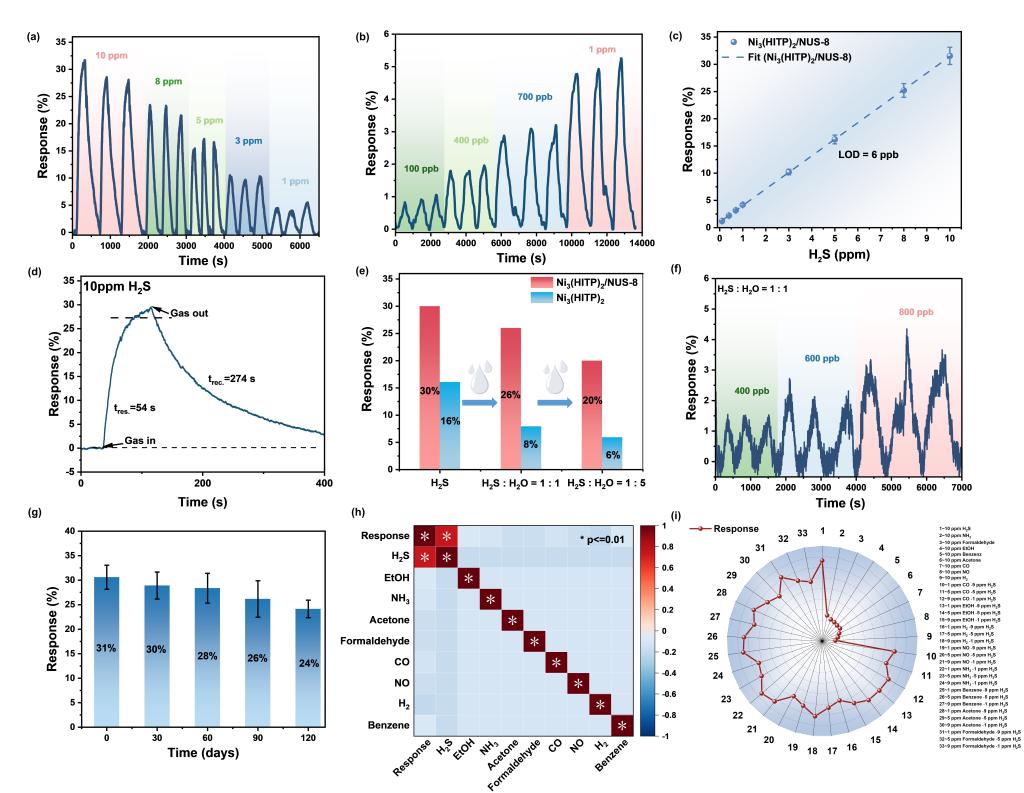 图2. 基于Ni3(HITP)2/NUS-8传感器的气体室温传感性能