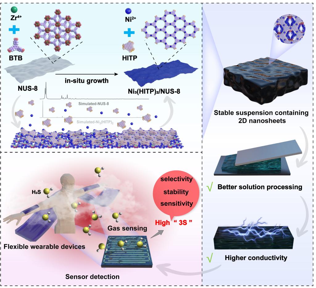 材料科学与工程学院张明明/袁泓晔团队以典型的Ni3(HITP)2(HITP = 2,3,6,7,10,11-己氨基三苯)和二维Zr-BTB MOF (NUS-8)作为研究对象,借助模板辅助生长策略,利用NUS-8的二维特性、溶液可加工性和Ni3(HITP)2的导电性,以及NUS-8和Ni3(HITP)2之间良好的晶格匹配效应,构筑了具有高导电性、优异的溶液可加工特性和高孔隙率的MOF-on-MOF结构(Ni3(HITP)2/NUS-8),并将其应用于超痕量H2S室温检测及柔性传感等领域(如图1)。