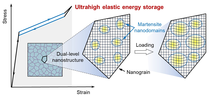 强度室科研人员提出了一种“双级纳米结构”微观设计策略,旨在形状记忆合金中实现优异的弹性储能。该策略如图1所示,通过构建预存纳米马氏体畴的纳米晶结构,基于无需形核的相变模式和晶界强化效应,同时实现高屈服强度、大弹性应变和低能量耗散。所开发的新型TiNiV形状记忆合金表现出超高弹性储能密度(> 40 MJ/m3)、能量效率(> 94%)以及优异的抗疲劳性。这种通过预先引入“相变种子”降低一级相变过程中的能量耗散,并利用晶粒细化提升材料强度,最终提升材料弹性储能的设计思路,有望拓展至其他相变体系,启发基于固态相变的其他功能特性的进一步优化,比如高介电储能、高效弹热制冷等。