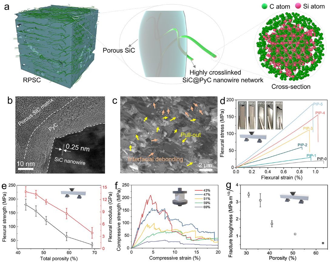 针对上述问题,王红洁教授团队以单晶SiC纳米线气凝胶为基体,通过构建具有高交联程度的层状SiC@热解碳(PyC)核壳纳米线网络,结合前驱体浸渍热解法(PIP),获得了优异强韧性的多孔SiC陶瓷。该多孔SiC陶瓷因存在丰富的纳米线/PyC、PyC/多孔SiC基体间的界面,在43%气孔率下,弯曲强度达187 MPa,压缩强度为215 MPa,断裂韧性为3.4 MPa·m1/2,且具有优异的机械能吸收能力(19.3 MJ m-3)。上述成果以《强韧多孔SiC陶瓷》(Strong and Tough Porous Silicon Carbide Ceramics)为题,于近期发表在《美国化学学会·纳米》(ACS Nano)上。牵手