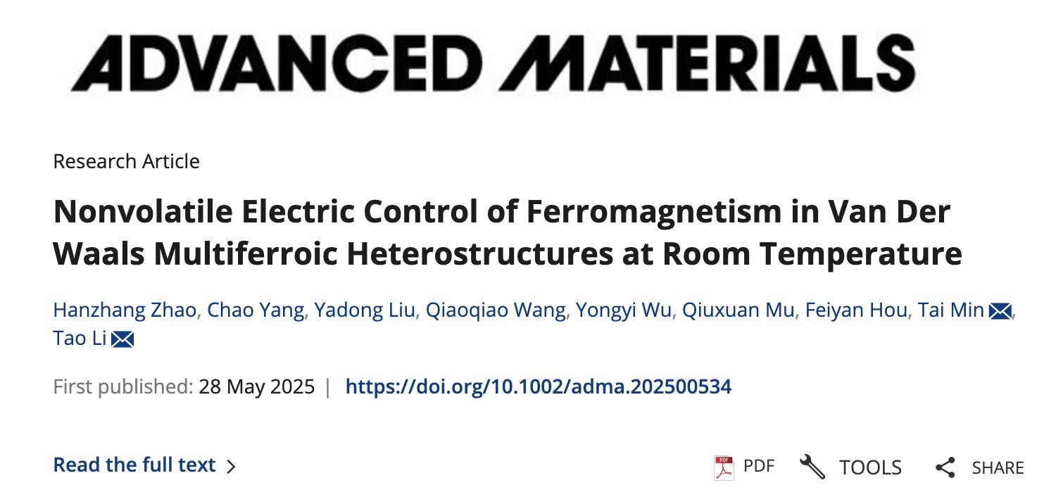 Hanzhang Zhao, Chao Yang, Yadong Liu, Qiaoqiao Wang, Yongyi Wu, Qiuxuan Mu, Feiyan Hou, Tai Min, Tao Li, Nonvolatile Electric Control of Ferromagnetism in Van Der Waals Multiferroic Heterostructures at Room Temperature. Adv. Mater. 2500534 (2025).