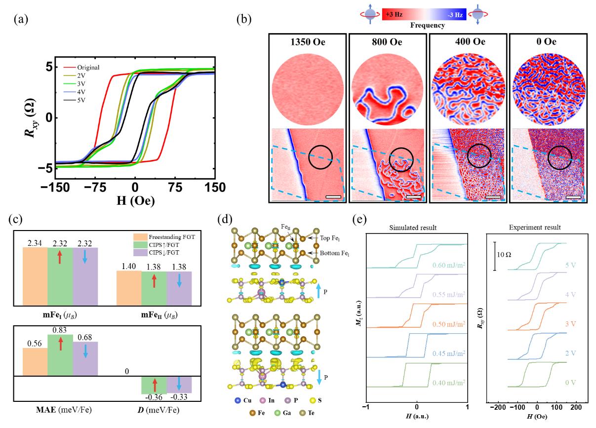 图1(a)器件的磁滞回线随极化电压的变化趋势;(b)Fe3GaTe2/CuInP2S6异质结中磁畴随外磁场的演变;(c)第一性原理计算CuInP2S6不同极化状态下Fe3GaTe2的Fe原子磁矩、各向异性能和DMI系数;(d)第一性原理计算的界面电荷转移,是导致Fe3GaTe2对称性破缺的主要因素;(e)微磁模拟复现霍尔测试实验结果。