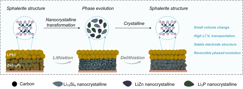 宋江选教授团队提出了一种具有可逆纳米晶相转变特性的低成本、高导电、高稳定性ZnSi12P3新型硅基负极材料。该材料在锂化过程中经电化学驱动可原位转化为Li15Si4、LiZn和Li3P纳米晶相,脱锂后可逆转变回原始的ZnSi12P3结构,从而有效缓解体积膨胀带来的应力并保持电极结构稳定性。该负极材料展现出高达2669 mAh/g的可逆比容量,并在与高镍三元正极匹配后,于3C高倍率条件下实现了超过3000次稳定循环。相关研究成果以《硅基负极中可逆的纳米晶相转变促进了全固态电池的稳定运行》(Reversible Nano Crystalline-Phase Transformation in Si-based Anode Enables Stable All-Solid-State Batteries)为题,发表于国际权威期刊《纳米快报》(Nano Letters)。牵手