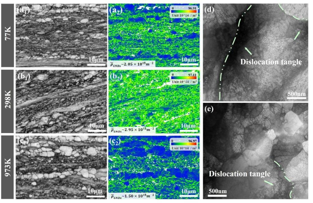 图2.异质结构难熔高熵合金在不同温度下的断裂样品的EBSD和TEM表征
