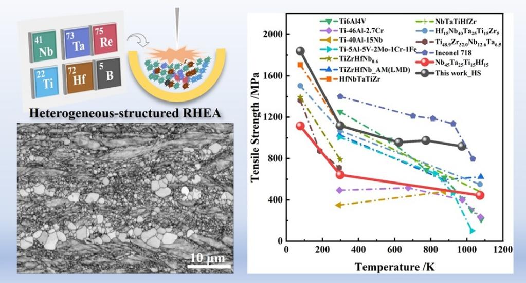 在航空航天、核能以及先进制造等前沿领域,结构材料需要在从深冷到高温的复杂环境中长期稳定服役。然而,传统合金普遍存在“强度–韧性”矛盾:强度提升往往伴随延展性降低,且在高温下强度衰减尤为明显。难熔高熵合金(RHEAs)由Nb、Ta、Mo、W、Hf等高熔点元素组成,凭借其优异的高温性能备受关注,但迄今仍难以在宽温域内兼顾高强度与高延展性。近年来,异质结构金属材料因其可诱发“异质变形诱导强化(HDI)”效应而备受瞩目,为解决强度–韧性矛盾提供了新思路。