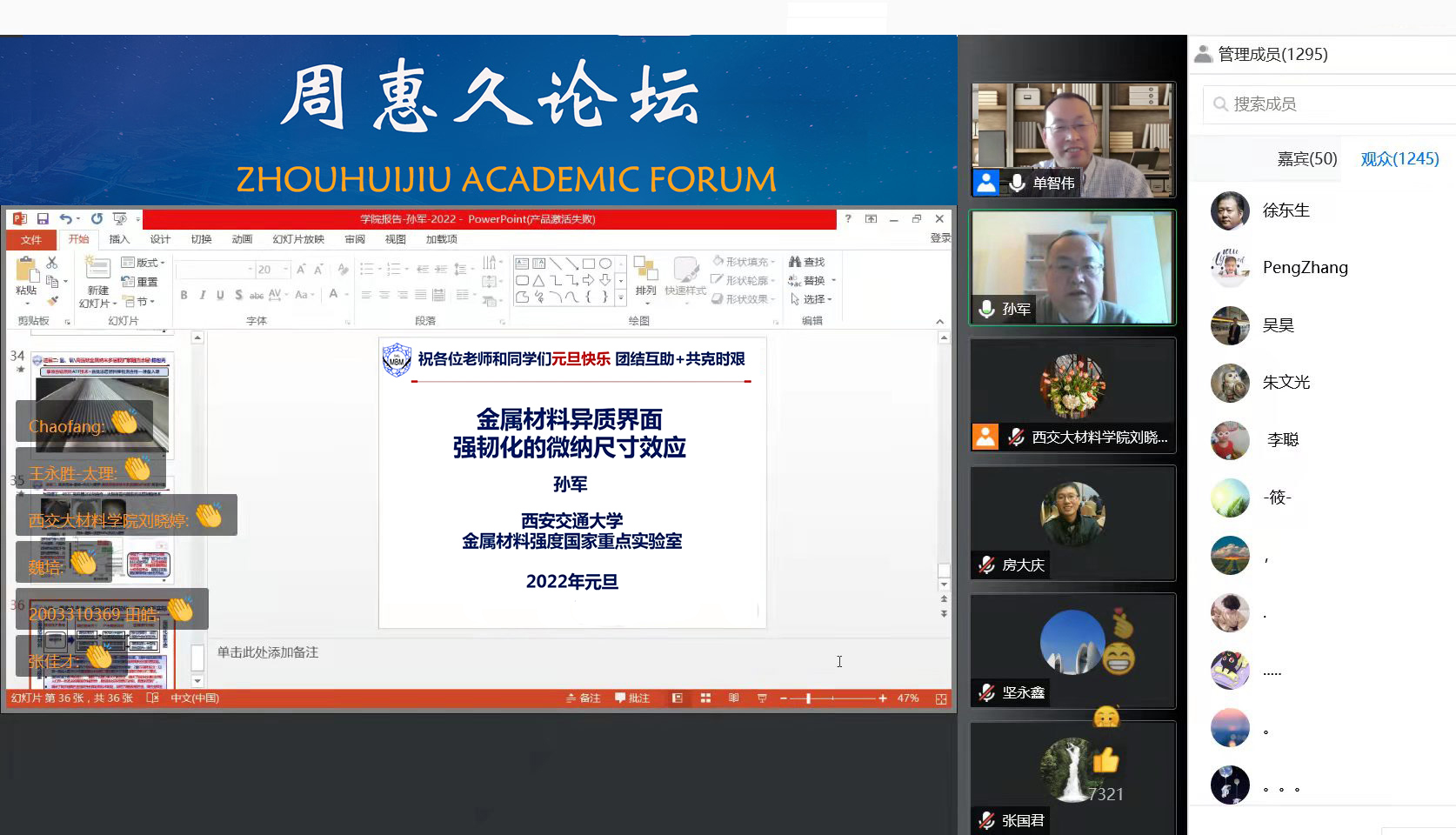 2022年1月1日,孙军院士做客周惠久论坛线上讲座,他以“金属材料异质界面强韧化的微纳尺寸效应”为题开启了新年第一讲。本次讲座由牵手