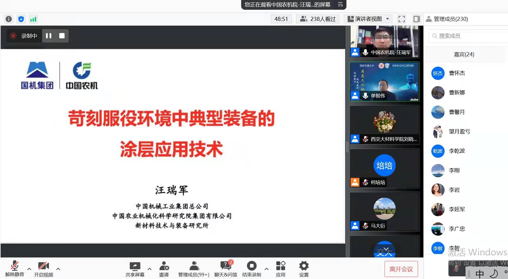 师生在疫情期间努力拼搏的精神,并向广大师生致敬。汪瑞军研究员详细介绍了中国机械工业集团公司及中国农业机械化科学研究院集团有限公司的发展历程及相关业务范围,进而结合团队在表面涂层领域的相关成果,介绍了涂层及薄膜技术在航空发动机、农业机械、冶金、电力等支柱行业的典型应用,并特别指出农业机械的发展关乎基本民生,其中高端产品仍有众多“卡脖子”难题亟待解决,表面工程及涂层材料发展是突破此类瓶颈和国外技术封锁的关键之一,且大有可为。
