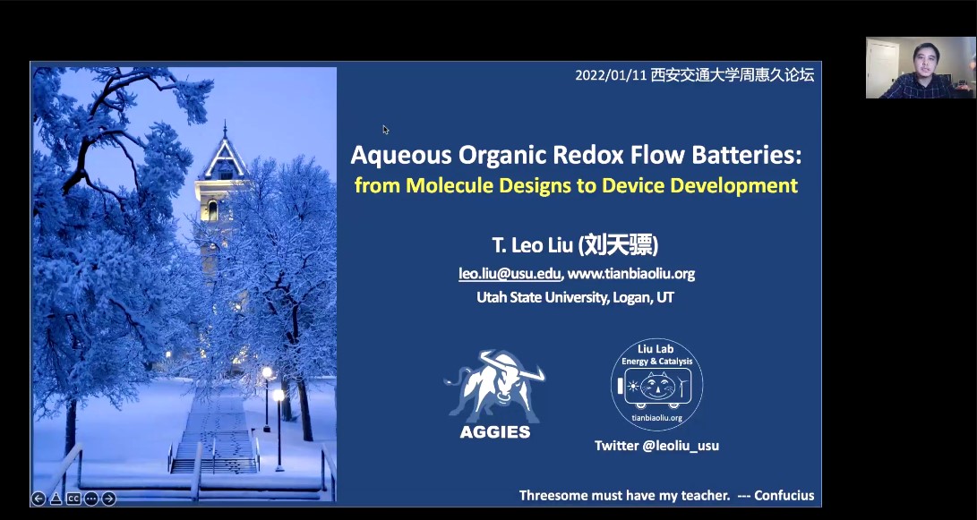 宋江选教授邀请,美国犹他州立大学化学和材料系刘天骠副教授做客周惠久论坛线上讲座,以《水系有机液流电池的储能应用》为题,为 牵手
