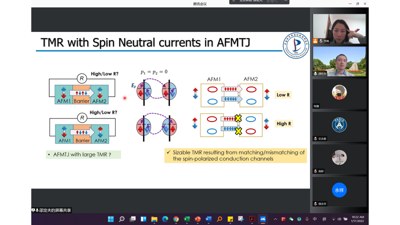 ,在线上进行了题为《Antiferroic tunnel junctions》的学术报告,介绍了铁电、铁磁材料在新一代芯片材料中的应用前景以及在反铁磁/反铁电器件领域的研究成果。本次讲座由李桃教授主持, 牵手