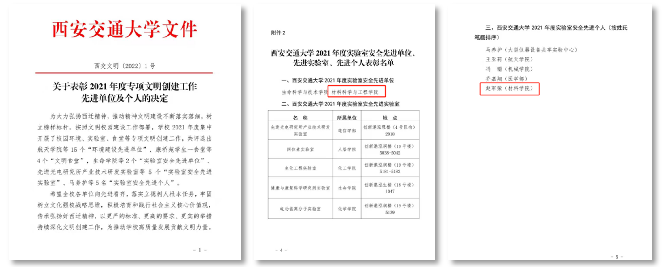 2021年度实验室安全先进单位(全校共2个),学院安全员赵军荣荣获实验室安全先进个人(全校共5人)。至此, 牵手