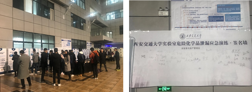 演练开始前,师生们参观了实验室安全展板。有研究生表示,观看展板以后才了解了自己所在实验室存在的一些安全隐患,并表示回去以后会立刻按照要求进行整改,杜绝一切可能会发生危险的因素。师生还在签名墙上签名,表达加强实验室安全的决心。