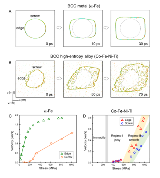 06-30体心立方结构(BCC)金属及合金作为一类重要的结构材料,自铁器时代以来就被人类广泛使用。金属材料的强度和塑性与内部缺陷位错的运动密切相关,研究位错的动力学行为对于揭示材料变形的微观机制、优化力学性能极为重要。在BCC金属中,刃型和螺型位错的运动特征具有较大差异:刃型位错滑移阻力非常低,以平滑、快速的方式运动;而螺型位错的临界启动应力较高,其运动速度受限于扭折形核速率,受热激活过程主导(见附图)。因此...